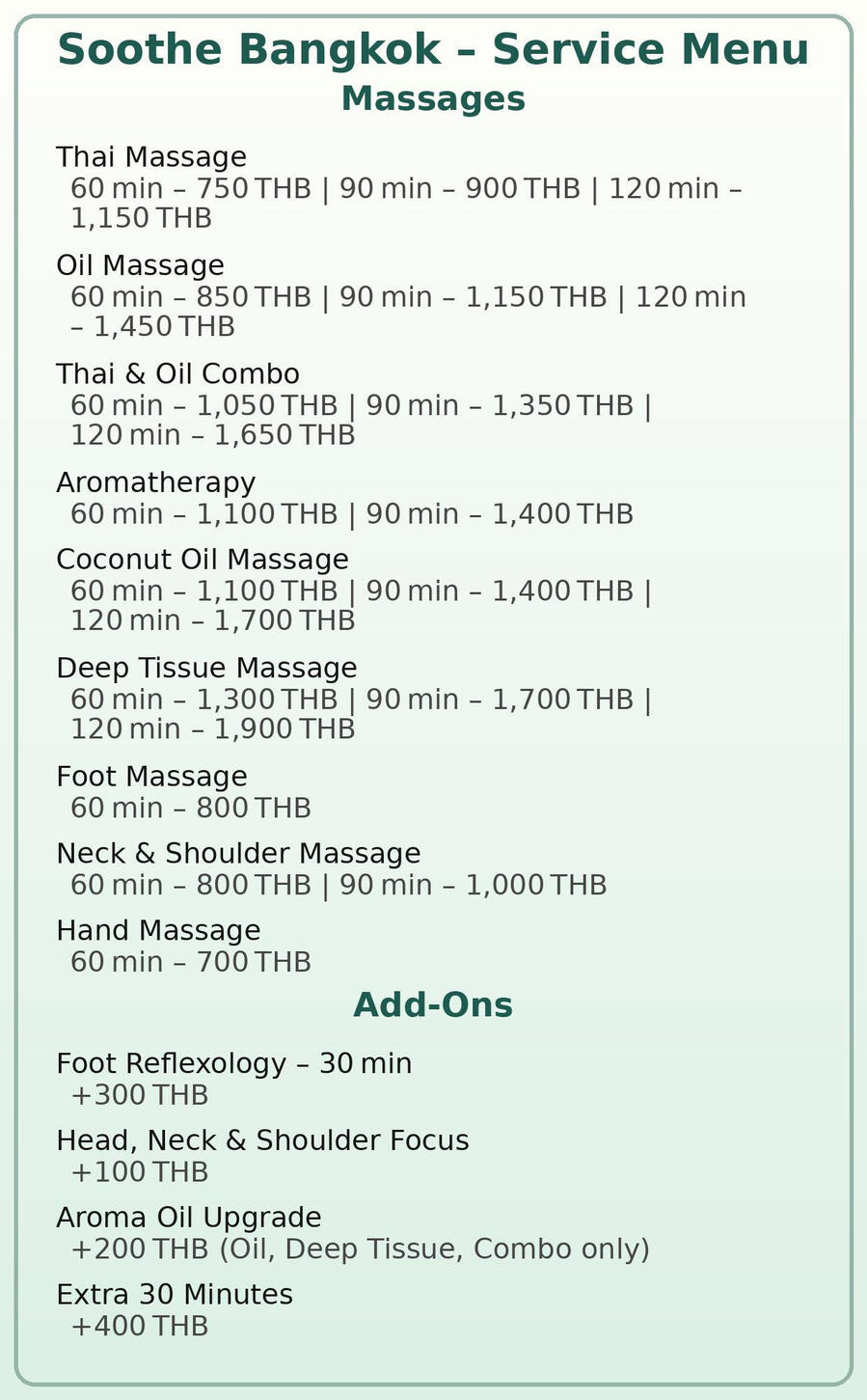 Soothe Bangkok provides professional in-room Thai massage services across Bangkok. Enjoy authentic Thai, Oil, Aromatherapy, Deep Tissue, and Combo massages performed by licensed therapists using clean linens and premium oils.
